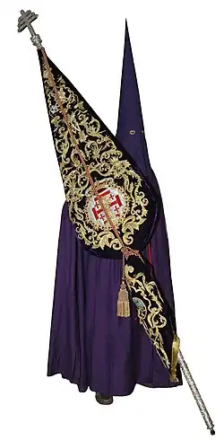 Con ocasión del 475 aniversario de la Sacramental de San Pedro, en la Semana Santa de 2012, se incorpora en el cortejo procesional del paso de Cristo.[10] Bajo diseño de Javier Sanchéz de los Reyes, la insignia es realizada en el taller de bordados de Genoveva Rodríguez (Albaida del Aljarafe), con pintura del beato realizada por Encarnación Hurtado Molina (Utrera).[11] El asta y las varas de acompañamiento están realizadas por el taller de Orfebrería Triana.[12]