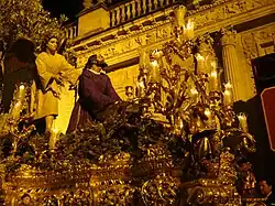 El primero de los pasos muestra a Jesús, en Getsemaní orando al Padre, tras el un ángel le conforta. El paso es obra de Manuel Guzmán Bejarano[2]