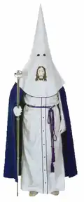 Túnica blanca ribeteada en morado y botones del mismo color, capuz blanco con el rostro de Jesús y cíngulo morado. Capa morada, alpargatas blancas con el rostro de cristo bordado o pintado, medias blancas y guantes blancos. Cetro con el emblema de la Cofradía.