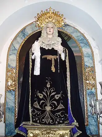 Es una dolorosa de candelero de vestir tallada en el primer tercio del siglo XVIII por un autor anónimo. Presenta una mirada baja y ojos enrojecidos..[5]