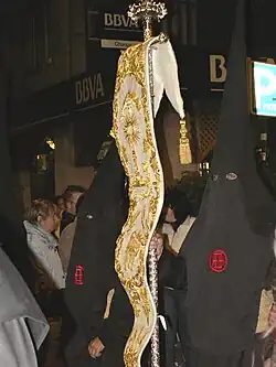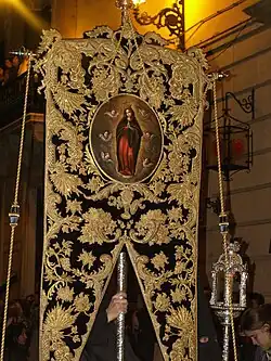 • Lábaro Sacramental: Bordado en estilo rocalla del taller de Felicitación Gaviero sobre tisú de plata portada sobre vara plateada rematada con la Inmaculada Concepción.