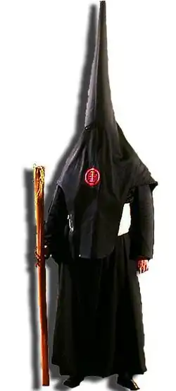 • Túnica: Antifaz negro de sarga con la Cruz de Jerusalén bordada en hilo rojo y hábito negro de cola en sarga, con cinturón ancho de esparto, calcetines negros y sandalias franciscanas.
