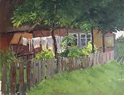 Hermine Overbeck-Rohte también tuvo su propio estudio en la casa Bröckener. No tuvo mucho tiempo para continuar con su pintura, porque la familia, la casa y el gran huerto exigían la mayor parte de su atención. En raros momentos capturó su entorno en los estudios, como en La entrada de nuestra casa en un día soleado de verano. El primer plano está completamente sombreado por los árboles que se encuentran en el lado derecho del camino. Los rayos del sol brillan a través del follaje y forman parches iridiscentes de luz y bañan partes de la entrada de la casa con una luz deslumbrante. Este sorprendente juego de luces y sombras ya está presente en sus estudios de Worpswede.