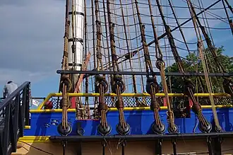 Los cañones no están perforados hasta el fondo, con lo cual, no son funcionales. Si lo hubieran sido, la Hermione habría sido considerada un barco de guerra, y como tal, tendría que haber pertenecido a la Armada Francesa.