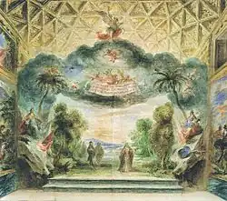 Boca de escena del Salón Dorado del Real Alcázar de Madrid para la representación de Los celos hacen estrellas de Vélez de Guevara, 1672; acuarela, Viena, Österreichische Nationalbibliothek, Cod. 13 217.