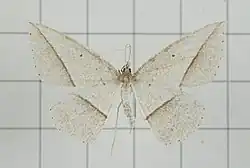 La envergadura de esta especie es de 39-44 mm. Las antenas del macho son bipectinadas, mientras que las de la hembra son filamentosas. El color principal del cuerpo y de las alas es blanco lechoso. El cuerpo del ala está densamente cubierto de finas manchas de color gris-marrón loto. El borde exterior del ala anterior está ligeramente curvado hacia afuera, el ápice es puntiagudo y hay un cuerpo de pequeñas manchas marrones al final de la celda central. Cuenta con una línea recta marrón oscura que se extiende desde el subápice del ala anterior hasta la mitad del borde interior. Hay una línea recta del mismo color en la mitad del ala posterior.[2]