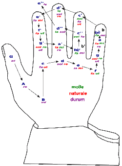 La mano sirve para ver la relación interválica de manera mnemotécnica. Como ejemplo, Guido utilizó Ut queant laxis, himno a Juan el Bautista cuya letra se compone de 6 pequeñas frases que comienzan con notas diferentes.