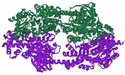 ![]() Glucokinasa humana. La flecha muestra el sitio activo con una molécula de glucosa. | ||||