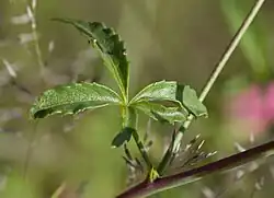 Es un arbusto perennifolio, que alcanza hasta 2 m de altura. Las hojas profundamente lobuladas o palmeadas con 3-5 foliolos, de hasta 10 × 3 cm, estrelladas peludas, con el margen dentado y un largo pecíolo de hasta 8 cm de largo. Las flores son solitarias, axilares, de hasta 10 cm de diámetro, de color amarillo crema , con un centro de color morado oscuro o marrón rojizo . El fruto es una cápsula ovoide con semillas de 5 × 3,5 mm en forma de media luna, muy finamente escamosas.