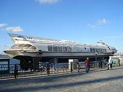 Un hidroala de la clase Meteor operando en el Volga es preparado para pasar el invierno en Kazán, Tatarstan, Rusia. En países donde los ríos se hielan durante el invierno, a menudo los hidroalas son sacados del agua, ya que el hielo puede dañar sus alas.
