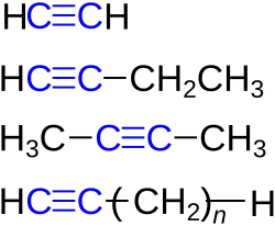 Son hidrocarburos insaturados que presentan como grupo funcional característico un enlace triple carbono-carbono. Se nombran sustituyendo la terminación -ano por -ino. Si presentan más de un triple enlace, las terminaciones utilizadas son: -adiino (dos), atriino (tres). La cadena se numera de manera que los localizadores de los triples enlaces sean los más bajos posibles. El compuesto con 2 átomos de C tiene el nombre vulgar de acetileno