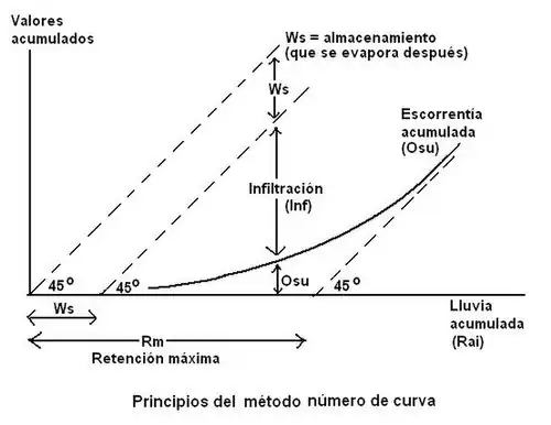 donde Rm es la retención máxima del área en la cual se aplica el método. Normalmente se tiene que Ws = 0.2 Rm y el valor de Rm depende de las características del suelo. El método del Número de Curva provee cuadros para determinar esta relación. El método rinde volúmenes acumulados de escorrentía. Para obtener la intensidad o velocidad de la escorrentía (es decir volumen por unidad de tiempo) hay que dividir la duración acumulada en varias elementos del tiempo (por ejemplo horas). |