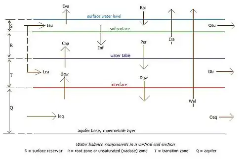 Los componentes del balance de agua se dejan agrupar conforme a las zonas en una sección vertical en el suelo constituyendo reservorios con flujo de entrada y de salida y almacenaje del agua:[2]