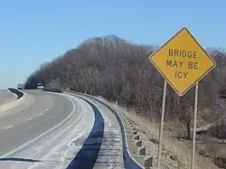 Señal de advertencia para hielo en puente. En ella se puede leer "Bridge May Be Icy" (el puente puede tener hielo).