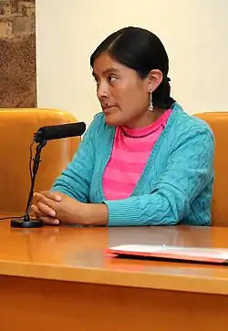![]() La activista peruana Nélida Ayay en la proyección del documental organizado por la ONG AIETI en el Salón de actos de la Biblioteca regional de Castilla-La Mancha (Toledo, 2016) | ||