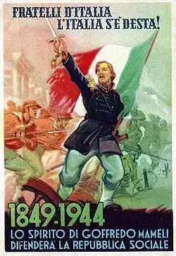 A menudo el Canto degli Italiani se le denomina de forma errónea como el himno de la República Social Italiana de Benito Mussolini. Sin embargo, está documentada la carencia de un himno oficial en este estado, que en las ceremonias ocupaba el himno de Mameli o Giovinezza.[60] El Canto degli Italiani y, en general, las ideas de la época de la unificación fueron utilizados por la República de Mussolini, en un cambio de ideas respecto al pasado, solo con fines de propaganda.[61]