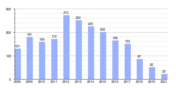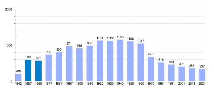 | Gráfica de evolución demográfica de Hinojales[2] entre 1842 y 2021 |