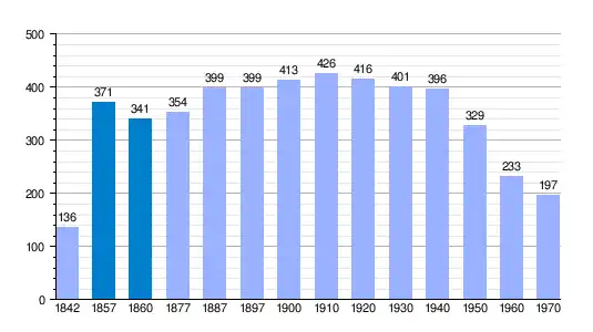 | Gráfica de evolución demográfica de Hinojar del Rey[1] entre 1842 y 1970 |