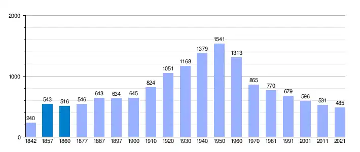 | Gráfica de evolución demográfica de Hinojosa del Valle[4] entre 1842 y 2021 |