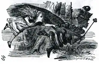 - ↑ Alicia, que es tomada de la mano por la Reina para que corran juntas, se asombra mucho al ver que, aunque corre lo más rápido que puede, sus alrededores no parecen cambiar:
