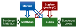 Para explicar los materiales en que coinciden Mateo y Lucas y que no se encuentran en Marcos, se postula una segunda fuente, conocida por estos dos evangelistas pero no por Marcos, que Mateo y Lucas habrían utilizado de forma independiente para completar la narración marcana. Esta fuente debería ser una colección de dichos de Jesús sin una conexión narrativa entre ellos. Johannes Weiss, en 1890, propuso denominar a esta fuente con la letra Q (de Quelle, que en alemán significa "fuente").