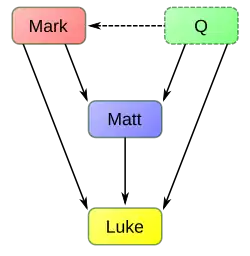 - ↑ H. J. Holtzmann, Zur synoptischen Frage, pp. 553–54 en «Jahrbücher für protestantische Theologie» 4 (1878).