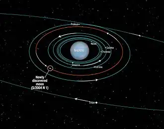 - ↑ a b c d e f g h Showalter, M. R.; De Pater, I.; Lissauer, J. J.; French, R. S. (15 de julio de 2013). «New Satellite of Neptune: S/2004 N 1». Central Bureau Electronic Telegrams (International Astronomical Union) 3586: 1. Bibcode:2013CBET.3586....1S. Consultado el 16 de octubre de 2023.