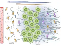 La hipoxia tumoral es un trastorno en el que las células tumorales han sido privadas de oxígeno. A medida que el tumor crece, sobrepasa rápidamente el suministro de sangre, dejando partes del tumor con regiones donde la concentración de oxígeno es significativamente menor que en los tejidos sanos. Los microambientes hipóxicos en los tumores sólidos son el resultado de una consumición de oxígeno disponible de entre el 70 y 150 μm de la vasculatura del tumor que cuando proliferan rápidamente las células tumorales limitan así la cantidad de oxígeno disponible para su difusión en el tejido tumoral. Con el fin de apoyar el crecimiento y la proliferación continua en entornos hipóxicos difíciles se ha descubierto que las células cancerígenas alteran su metabolismo. Asimismo, se sabe que la hipoxia cambia el comportamiento celular y está relacionada con la remodelación de la matriz extracelular y el aumento del comportamiento migratorio y metastásico.