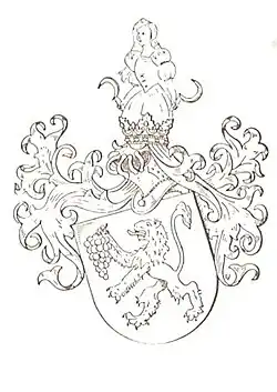 - Escudo de 1790 (idéntico al de la familia Hippel de maestros herreros, familia de ricoshombres en el Principado de Sagan en el siglo XV): un león dorado vestido de azul que sostiene una uva en sus patas delanteras. Sobre el casco con cubiertas azules y doradas, una doncella en crecimiento vestida de blanco con un corpiño azul, sostiene una hoz con un mango dorado en cada mano.