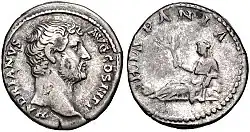 Adriano hacía frecuentes viajes a muchas provincias del Imperio, y para conmemorar estos viajes de forma propagandística se acuñaron monedas relativas a estos viajes por cada provincia. Una de ellas corresponde al viaje de Adriano a Hispania. La alegoría de Hispania más famosa se acuñó en Roma; era una figura femenina con una túnica larga, timbrada con laurel u olivo, reclinada hacia la izquierda, con su brazo izquierdo sobre unas rocas, que podrían hacer referencia a los Pirineos. Con su mano derecha sostiene una rama de olivo. A los pies de la figura aparece un conejo, el animal que teóricamente los fenicios emplearon para nombrar a la península: Hishphanim.