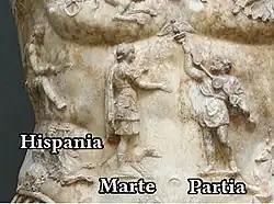 En la coraza de la estatua de Augusto de Prima Porta aparece Hispania en la parte diestra (a la izquierda según se mira la escultura). Se encuentra a espaldas de Marte, dios de la guerra, en posición sedente y afligida portando la gladius hispaniensis. El hecho de que se haya representado de espaldas a Marte y derrotada alude a la victoria de Augusto frente a cántabros y astures.[3]