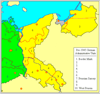 En la conferencia de Potsdam realizada en agosto de 1945, poco después de la rendición incondicional de la Alemania Nazi el 8 de mayo de 1945, los Aliados dividieron Alemania en cuatro zonas de ocupación militar —Francia al suroeste, Reino Unido al noroeste, Estados Unidos al sur, y la Unión Soviética al este—. Las antiguas (1919-1937) provincias de Alemania al este de la Línea Oder-Neisse (Prusia oriental, el este de Pomerania y Silesia) fueron transferidas a Polonia, mudando el país hacia el oeste. Aproximadamente 15 millones de alemanes étnicos sufrieron terribles penalidades de 1944 a 1947 durante su huida y expulsión de los territorios de Alemania del este y de Sudeste.[2]