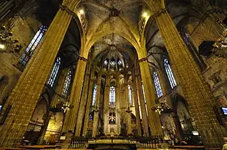 Cabe remarcar también la importancia que en la era medieval tuvo la Iglesia católica, presente en la vida de la ciudad a través de diversas órdenes monásticas que erigieron multitud de conventos y monasterios por todo el perímetro urbano: benedictinos (San Pablo del Campo, San Pedro de las Puellas, Valldaura, Santa María de Valldonzella, Santa María de Jonqueres), templarios (establecidos en lo que luego sería el Palacio Real Menor), hospitalarios (Hospital de la Santa Cruz), franciscanos (convento de San Francisco, llamado Framenors), dominicos (convento de Santa Catalina), trinitarios (convento de Nuestra Señora de la Buenanueva), agustinos (convento de San Agustín), carmelitas (convento del Carmen), orden del Santo Sepulcro (monasterio de Santa Ana), etc.[135] En Barcelona surgió además la orden mercedaria, tras la aparición según la leyenda de la Virgen de la Merced a Jaime I, san Raimundo de Peñafort y san Pedro Nolasco en 1218, a los que impuso la redención de cristianos cautivos de musulmanes; establecidos en el convento de la Merced (actual Capitanía General de Cataluña), su culto se difundió rápidamente y, en 1687, la Merced fue declarada patrona de la diócesis de Barcelona.[136]