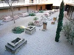 Del resto de elementos urbanos conservados de época romana conviene resaltar la necrópolis, un conjunto de tumbas situado en el exterior del área amurallada, en la actual plaza de la Villa de Madrid: cuenta con más de 70 tumbas de los siglos II y III, descubiertas casualmente en 1954.[67] También hay restos de dos acueductos que conducían las aguas hacia la ciudad, uno de ellos desde la sierra de Collserola, al noroeste, y otro desde el norte, tomando agua del río Besós; ambos se unían enfrente de la puerta Praetoria de la ciudad (actual plaza Nueva).[68] Otros restos son los de una domus (casa familiar) situada en la calle San Honorato, en el subsuelo del edificio del Departamento de Presidencia de la Generalidad de Cataluña, originarios del siglo IV y excavados en 2003. Una parte significativa de la antigua Barcino es visible en el subsuelo arqueológico del Museo de Historia de Barcelona, donde también se encuentran testimonios de sus monumentos y de la vida cotidiana de sus habitantes.[69]