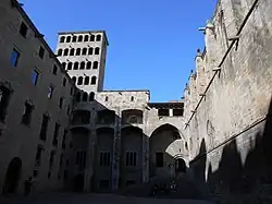 En 1365 estableció su sede en Barcelona la Generalidad de Cataluña,[nota 9] un organismo encargado de recaudar tributos y supervisar el cumplimiento de los acuerdos tomados en Cortes, lo que en la práctica equivalía al gobierno ejecutivo del reino. Aunque su ámbito era todo el territorio catalán, su ubicación en Barcelona comportó un cierto control sobre los asuntos urbanos. Entre otras funciones de la Generalidad figuraban cometidos militares vinculados a la defensa, orden público y mediación en disputas judiciales —algo parecido a un Tribunal Supremo— y, por lo general, fue un instrumento de la oligarquía para mantener sus privilegios frente a la monarquía. Su presidencia solía recaer en altos cargos de la jerarquía eclesiástica.[145]