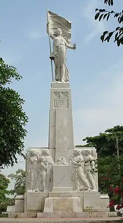 El jazz hizo su aparición en Barranquilla en 1921 con la Orquesta Panamá Jazz Band presentada en un club social, el Club ABC.[98] Sin embargo, según el sociólogo Adolfo González Henríquez a principios de los años 1920, la música de la costa no es favorecida por las clases altas de la ciudad que prefieren estilos musicales de la Belle Époque Europea que los inspiraron a copiar la frivolidad londinense o parisina en ese momento. No fue hasta la década de 1960 cuando comenzaron a formarse unos pocos círculos que escuchaban programas de radio dedicados al jazz, como El Maravilloso Mundo del Jazz. Además, incluso si HJN se convierte en la primera estación de radio de Colombia el 5 de septiembre de 1929 en Bogotá, es en Barranquilla donde nace el 8 de diciembre del mismo año la primera estación de radio comercial. Esta estación, que también es la primera estación con olas largas y cortas, es creada por Elías Pellet Buitrago bajo el nombre de HKD antes de convertirse en La Voz de Barranquilla.[99] Barranquilla es también el hogar de la primera radio FM del país, 96.1 (Radio Tiempo).[100] Barranquilla, a través del Decreto 1108 de 1925, es la primera ciudad de Colombia en hacer cumplir la ley 28 del 16 de febrero de 1925 aprobada por el Congreso que se establece el Día Nacional de la Bandera, conmemorado cada 7 de agosto.[101] Este día conmemora el 7 de agosto de 1819, fecha de la batalla de Boyacá entre los ejércitos español y el republicano, sellando la independencia definitiva de Colombia. El monumento de la bandera de Barranquilla, diseñado por el italiano Tito Ricci, fue hecho por el escultor Marco Tobón Mejía en París. Transportados desde la capital francesa a Barranquilla en el vapor Colombo, la estatua llega 14 de agosto de 1931 y fue inaugurado el 11 de noviembre del mismo año después de haber sido instalado en la parte más alta del parque Once de noviembre.[102]