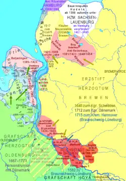 En 1411 los duques que gobernaban juntos en Sajonia-Lauemburgo, Erico IV y sus hijos Erico V y Juan IV, empeñaron su parte del castillo y bailío de Bederkesa al senado de Bremen, incluyendo todo "aquello que tengan en las jurisdicciones en la Tierra Wursten frisia y en Lehe (Bremerhaven), que pertenece a los anteriormente mencionados castillo y Vogtei".[5] Su parte en la jurisdicción, Vogtei (bailío) y castillo habían sido adquiridos de los caballeros de Bederkesa, afectados por la peste.[5] En 1421, Bremen adquirió también la mitad restante de los derechos de los caballeros de Bederkesa, incluyendo la parte que les quedaba en el castillo de Bederkesa.[4] Bremen volvió a ser expulsada de la Liga Hanseática en 1427.