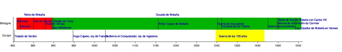 La unidad de la región bajo la forma de reino de Bretaña se hizo en 851 con el rey Erispoe, hijo de Nominoë, pero no perduró debido a las disputas de sucesión e incursiones de los vikingos. Desde 939, un ducado de Bretaña tomó su lugar en las fronteras casi definitivas, administradas por los duques de casas bretonas de 939 a 1166, antes de que cayese en la esfera de influencia de los Plantagenet y los Capetos. La Guerra de Sucesión de Bretaña vio enfrentarse desde 1341 hasta 1364, en el contexto de la Guerra de los Cien Años, diferentes facciones que lucharon por apropiarse del ducado. Un poder autónomo surgió entonces durante los siglos XIV y XV, lo que condujo a una política de independencia vis-à-vis del reino de Francia pero que finalmente resultó en la unión de Bretaña a Francia en 1532.