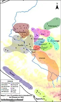 - ↑ Gutiérrez Cruz, Sergio Nicolás (2004). Chiapas histórico:. de la independencia a la revolución,. Gobierno de Chiapas : Secretaría de Educación. p. 52. OCLC 182584021. Consultado el 30 de mayo de 2019.