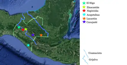 - ↑ Xóchitl Leyva Solano y Gabriel Asencio Franco (1996). Fondo de Cultura Económica / CIESAS, ed. Lacandonia al filo del agua. p. 50-60.