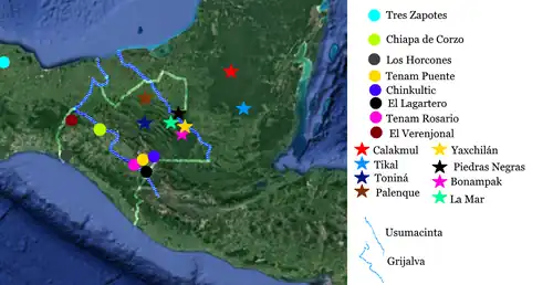 En la cuenca superior del río Grijalva se desarrollaron otros centros mayas como Tenam Rosario y El Lagartero. A diferencia de otras zonas mayas, aquí los grupos humanos no se congregaron en grandes urbes, sino que tendieron a hacerlo de manera dispersa.[29]: 95–97 La comparación de los estilos cerámicos demuestra que la zona no estuvo aislada del resto del mundo maya y que tuvo un papel fundamental en el sistema comercial que unía la zona de los Altos de Guatemala con el Golfo, la zona zapoteca y el Altiplano Central a través del río Grijalva.[30]: 196–176
