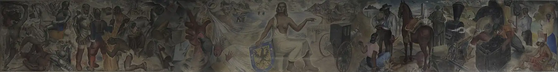 El mural, de 258 metros cuadrados de superficie, con 62 metros de largo por 4.5 metros de alto,[2] es una de las obras de mayores dimensiones del artista.[4] Está realizado con la técnica del fresco, la cual requiere menos mantenimiento que otras técnicas pictóricas. Esta técnica consiste en la mezcla de tierra de color molida con agua pura, que luego se aplica sobre una mezcla de cal y arena. Esto conforma la pintura, que debe ser aplicada con pinceles blandos.[5]