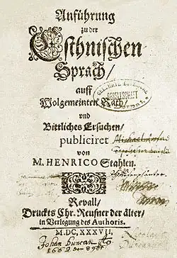 En 1637 Heinrich Stahl publicó la primera gramática de la lengua estonia[27] . Johann Fischer de Lubeck fundó una editorial en Riga que no solo tradujo y publicó libros en letón, sino en estonio.