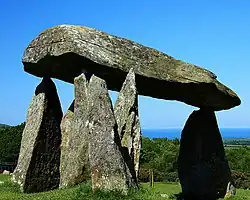 Se estima que las primeras comunidades agrícolas surgieron en torno al 4000 a. C., marcando los inicios del período Neolítico en la zona. De la península ibérica llegaron por mar colonizadores que se integraron con los pueblos ya presentes y favorecieron la sedentarización de los habitantes de la región, dentro del proceso de la revolución neolítica.[7] Los nuevos pobladores despejaron los bosques para establecer tierras de pastoreo y de cultivos, desarrollaron tecnologías para la elaboración de cerámicas y de textiles, y construyeron cromlechs como los de Pentre Ifan, Bryn Celli Ddu y Parc Cwm long cairn.[8] Durante este período se construyeron muchas cámaras funerarias, siendo las más notables las de Bryn Celli Ddu y Barclodiad y Gawres en Anglesey.[9] Las herramientas de metal aparecieron en Gales en torno al 2500 a. C., al principio de cobre y posteriormente de bronce. Se cree que durante los inicios de la Edad de Bronce galesa (2500-1400 a. C.) el clima era más cálido que en la actualidad, a juzgar por los restos ecológicos. Gran parte de la producción de cobre para la producción de bronce procedía probablemente de las minas de cobre de Great Orme, donde se han encontrado restos de actividad minera estable durante varios siglos del período.[10]