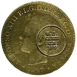 Moneda española de Alfonso XIII con resello conmemorativo de la ocupación alemana en 1899.