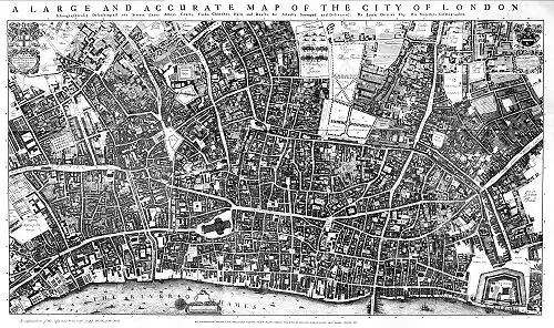 - ↑ Título original (en inglés): A Large and Accurate Map of the City of London. Ichnographically describing all the Streets, Lanes, Alleys, Courts, Yards, Churches, Halls, & Houses &c. Actually Surveyed and Delineated by John Ogilby, His Majesties Cosmographer.