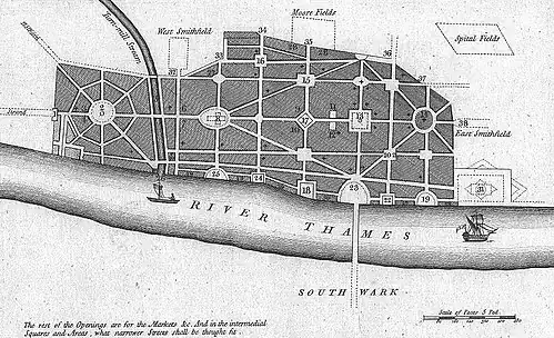 La expansión de Londres más allá de los límites de la City se estableció de forma decisiva en el siglo XVII. En los primeros años de ese siglo, los alrededores inmediatos de la City, con la principal excepción de las residencias aristocráticas en dirección a Westminster, seguían considerándose poco propicios para la salud. Inmediatamente al norte estaba Moorfields, que recientemente había sido drenado y acondicionado en paseos, pero era frecuentado por mendigos y viajeros, que lo cruzaban para entrar en Londres. Junto a Moorfields se encontraban Finsbury Fields, campo de práctica favorito de los arqueros, y Mile End, entonces un lugar común en la Great Eastern Road y famoso como punto de encuentro de las tropas.