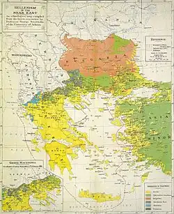 Con el fin de la guerra en noviembre de 1918, el caído Imperio otomano estaba listo para ser repartido entre los vencedores, y Grecia esperaba ahora que los Aliados cumplieran sus promesas. En gran medida, gracias a los esfuerzos diplomáticos de Venizelos, Grecia obtuvo a Tracia Occidental en el Tratado de Neuilly en noviembre de 1919[49] y Tracia Oriental y una zona alrededor de Esmirna en Anatolia occidental (ya bajo administración griega como la Ocupación de Esmirna desde mayo de 1919) en el Tratado de Sèvres de agosto de 1920. El futuro de Constantinopla quedaba por determinar. Pero al mismo tiempo, en Turquía surgió un Movimiento Nacional Turco liderado por Mustafa Kemal (más tarde Kemal Atatürk), que estableció un gobierno rival en Ankara y se dedicó a luchar contra el ejército griego.[50]