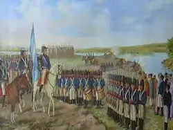 - ↑ En realidad no es una bandera sino una banderola de batallón ya que el que la porta no es un abanderado sino el comandante de artillería Martínez (observar su cimera). Belgrano al dictarle la situación a Carbonnier tal vez quiso dejar bien claro que la de dos franjas no era una bandera.