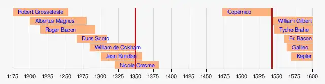 La línea de tiempo muestra abajo a los científicos occidentales más relevantes desde la Alta Edad Media hasta el año 1600. La línea roja vertical muestra el hiato entre la Peste Negra y la fecha de publicación del siguiente trabajo científico: el modelo heliocéntrico de Copérnico. Entre ambos hechos hay más de 200 años.